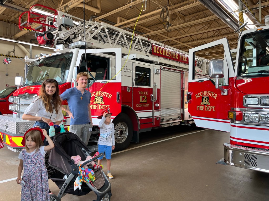 Ku naszemu zdziwieniu – po raz kolejny- strażacy byli bardzo mili i otwarci, jak prawie wszyscy amerykanie, których do tej pory spotykaliśmy. (O gościnności amerykańskiej szczególnie w Minesocie możecie poczytać w poprzednim poście) Zaprosili nas do środka, pokazali swoje wozy, mogliśmy z bliska obejrzeć cały sprzęt, mało tego każde dziecko dostało kask strażacki. Szczerze się przyznam, że byłem bardziej podjarany niż Jasio z Tomkiem. Moje dziecięce marzenie bycia strażakiem się spełniło 😉