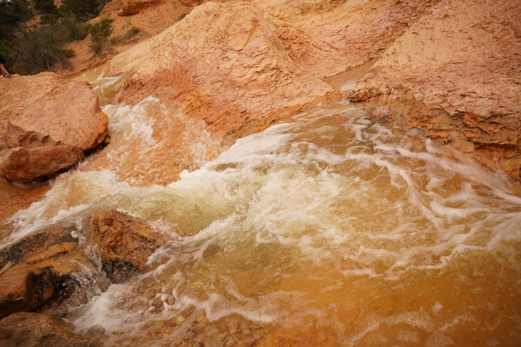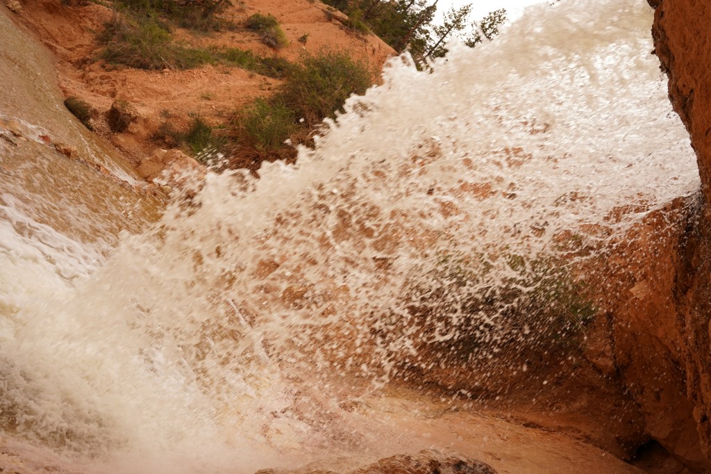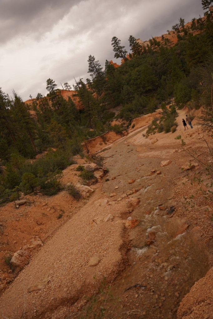 przejeżdżaliśmy spusty dla wody z flash flooding. Wyjeżdżaliśmy szutrową i kamienistą droga pod duże wzniesienia gdzie zastanawialiśmy się czy w połowie nie zatrzymamy auta gdyż nie da rady dalej. Na szczęście nasz Fordzik dał radę i dojechaliśmy na miejsce. Przyglądaliśmy się czarnym chmurom zewsząd nas okalającym i cały czas myśleliśmy pójść czy odpuścić ? Jechaliśmy tu przecież specjalnie 2 h…Asia bardzo oponowała przed wyjściem ja natomiast nie chciałem rezygnować. Niestety gwoździem do trumny był moment kiedy wyszliśmy z auta i zaczęło bardzo głośno grzmieć. Nie mieliśmy wyboru, sam może jeszcze bym spróbował ale z całą rodziną trzeba było odpuścić , gdyż jeśli nawet nie było by powodzi błyskawicznej to jeśli by zaczął padać deszcz to ziemia by tak namokła ze nie wydostali byśmy się tym autem z tamtego miejsca. Do tego wcześniej w każdym parku Rangerzy powtarzają, ze gdy nawet zbierają sie chmury na niebie lub słychać grzmoty to nie wolno wyruszać na szlak, gdyż wiele osób przypłaciło błędna decyzje życie Poniżej zdjęcie miejsca z którego musieliśmy zrezygnować.