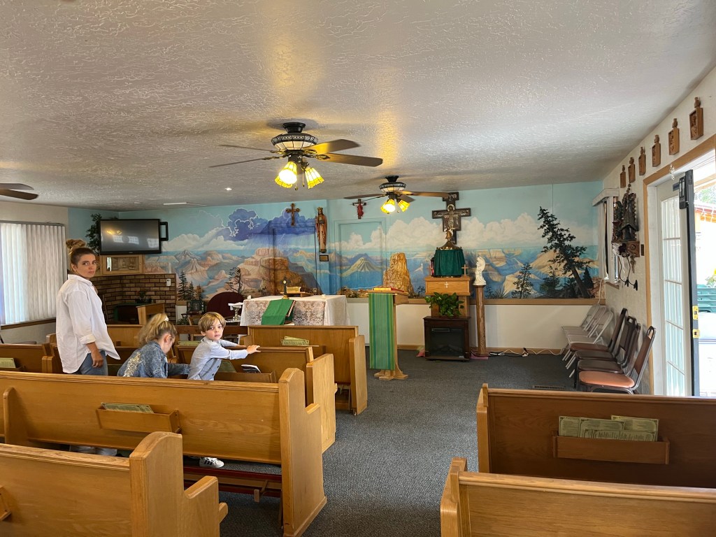 Uwieńczeniem a zarazem zakończeniem 3 dniowej przygody w Wielkim Kanionie była kameralna Msza Święta w małym, górskim , kolorowym kościółku. Na zakończenie ksiądz poprosił w modlitwie o opiekę św Rafała Archanioła szczególnie dla tych którzy mają daleka podróż przed sobą. Byliśmy bardzo poruszeni tym doświadczenie i poczuciem nieustannej opieki „z góry” 😉