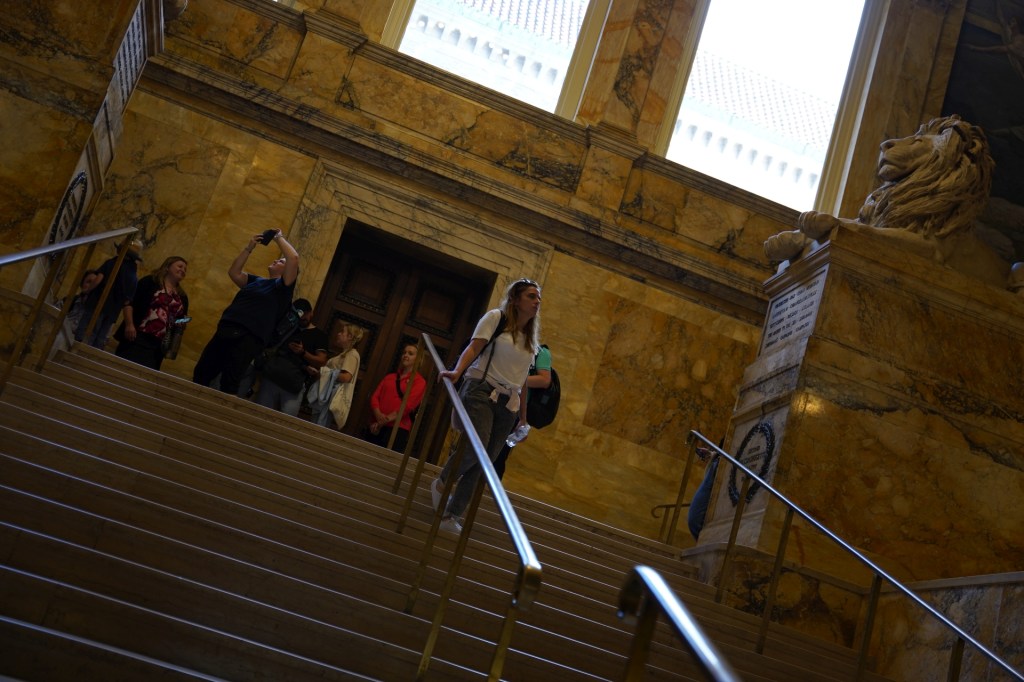 Po mieście mieliśmy wspaniałą przewodniczkę, która oprowadziła nas po niezwykle ciekawych i ślicznych miejscach tej metropolii. Zwiedzanie rozpoczęliśmy od wizyty w prawdziwej amerykańskiej bibliotece, którą wcześniej widzieliśmy jedynie na filmach, gdzie mogliśmy pośród tysięcy książek zobaczyć studentów przygotowujących się do zaliczeń. Biblioteka ma swój klimat, nikt tu nie pędzi, nie śpieszy się, a wszechobecna cisza po wejściu ze zgiełku miasta jest miodem dla naszych uszu.