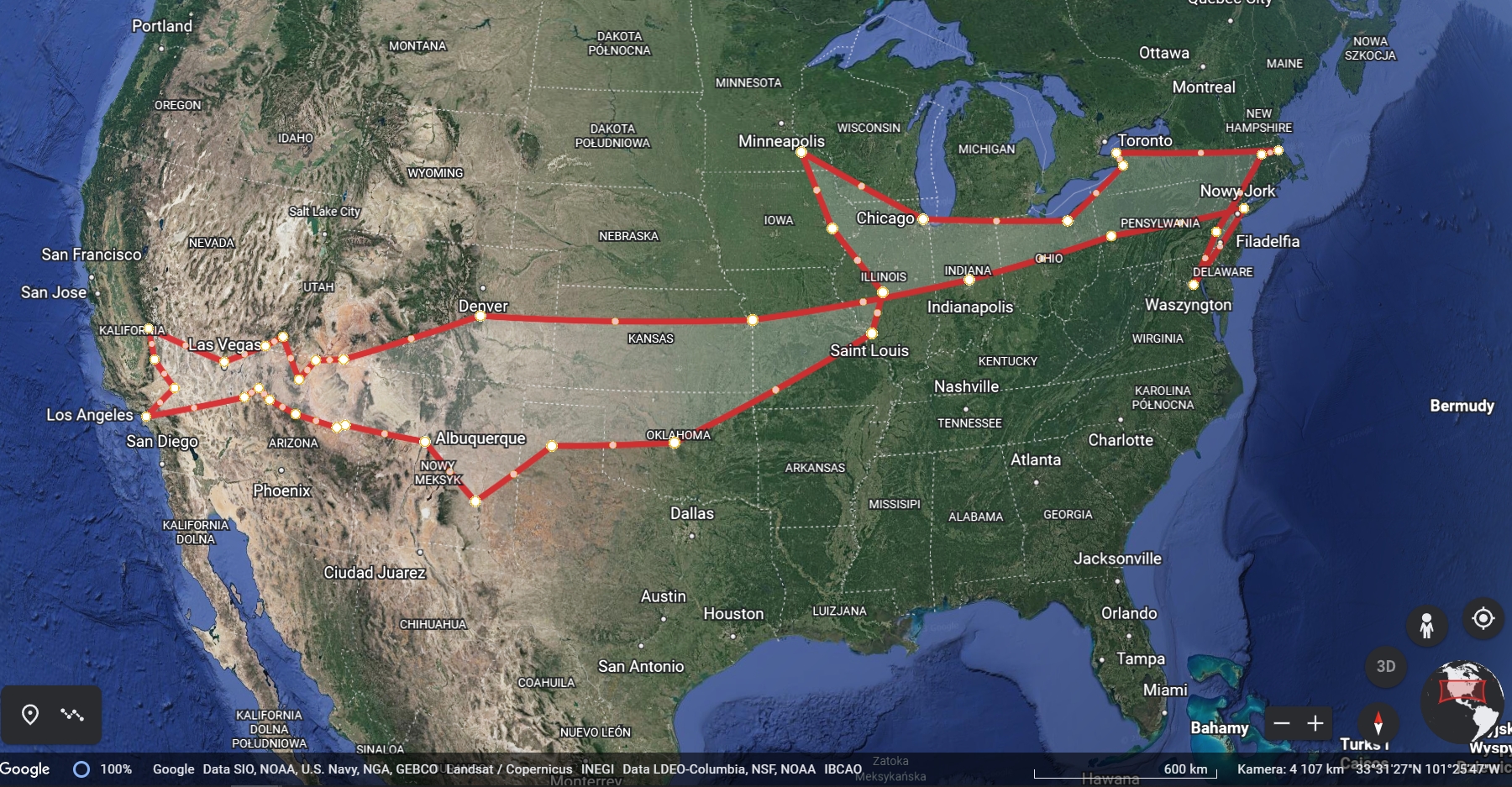 Chicago – Rochester – Pontiac – Springfield – Branson – Oklahoma city – Elgin – Amarillo – Roswell – Albuquerque – Holbrook – Wiliams – Kingman – Selingman – Barstow – Los Angeles – Santa Barbara – Sequoia park – Isabella camp – Death Valley – Las Vegas – Hoover Dam – Zion Park – Willis creek sloth canion – Page – Grand Canion – Monument Valley – Burlington – Kansas city – Indianapolis – Duquasne New York -Waszyngton – Doylstown – Worcester – Boston – Buffalo – Niagara – Cleveland – Chicago